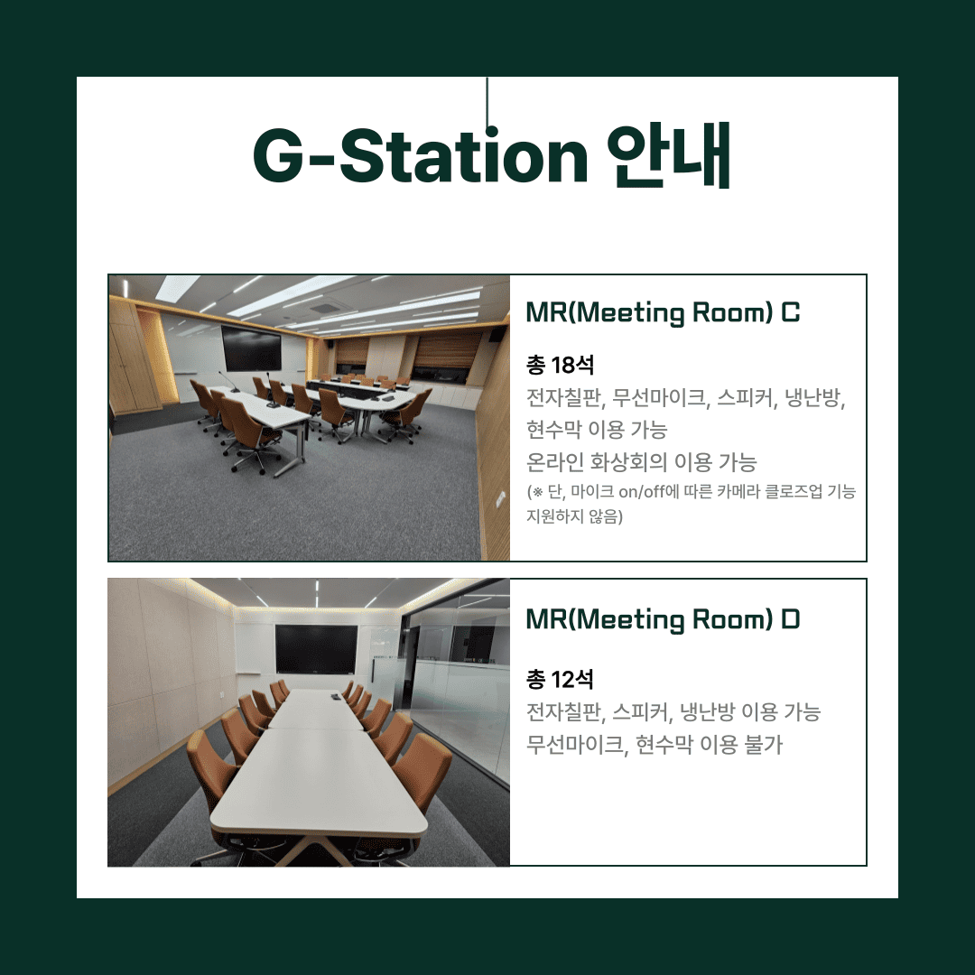 2) G-station 구성 - MR A 1실(총 24석) : 전자칠판, 무선마이크, 스피커, 냉난방, 현수막게시, 온라인 화상회의 ZOOM 가능 - MR B 1실(총 14석) : 전자칠판, 스피커, 냉난방 가능(무선마이크, 현수막 이용불가) - MR C 1실(총 18석) : 전자칠판, 무선마이크, 스피커, 냉난방, 현수막게시, 온라인 화상회의 ZOOM 가능 - MR D 1실(총 12석) : 전자칠판, 스피커, 냉난방 가능(무선마이크, 현수막 이용불가) - 1인 ROOM 총 2실 : 테이블, 의자, 냉난방, 무선충전 가능 - 휴게 및 소통공간 라운지 - 오픈키친