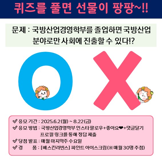 국방산업경영학부 OX 퀴즈를 풀면 선물을 드려요!! 국방산업경영학부 인스타그램 팔로우 + 이벤트 게시물 좋아요❤ + 댓글을 달아주시고 프로필 링크를 통해 정답을 제출해주시면 6월, 7월, 8월 총 3개월 동안 각각 30명씩 추첨을 통해 베스킨라빈스 파인트 아이스크림을 드립니다?? 올 여름 국방산업경영학부 이벤트 참여하시고 시원~하게 보내세요~!! [건양대학교 국방산업경영학부 O/X 퀴즈 이벤트] ✅ 응모 기간 : ~ 8.22(금)까지 응모가능 ✅ 경품 : [배스킨라빈스] 파인트 아이스크림(30명 추첨) ✅ 응모 방법 1. 국방산업경영학부 인스타그램 팔로우+인스타 게시글 좋아요+댓글달기 2. 프로필 링크를 통해 정답 제출 ✅ 당첨발표 : 6월,7월,8월 마지막째주 수요일