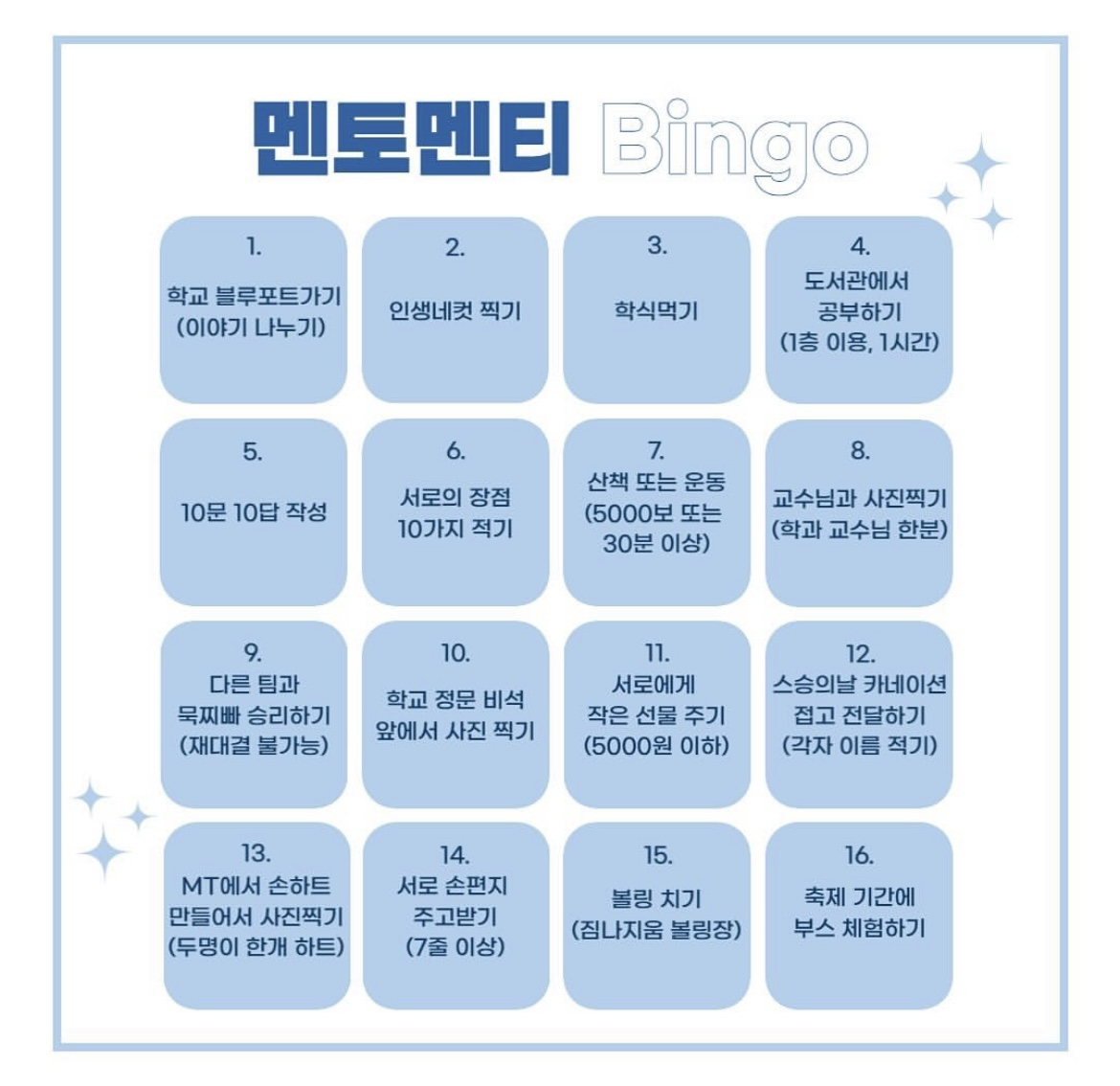 신입생과 선배의 멘토멘티 프로그램을 통하여 화합을 다지고자 학과 자체 빙고프로그램 미션 달성 프로그램 운영하였습니다. 운영결과 빙고프로그램에 선착으로 먼저 채우는 팀이 선정되어 결과를 안내드립니다.