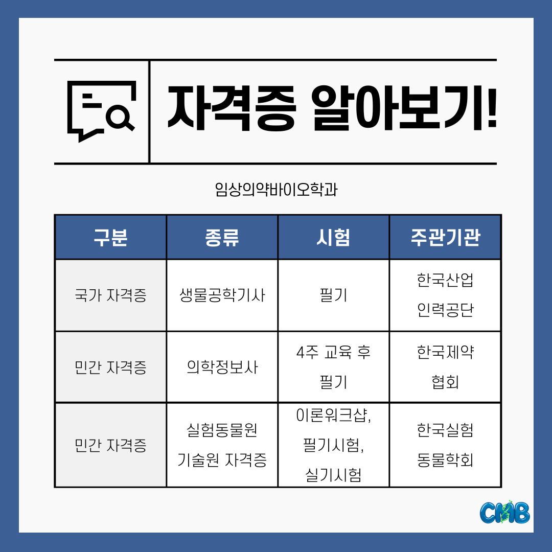 『 [카드뉴스] 임상의약바이오학과 자격증 소개 』글의 상세내용을 확인하는 표로 제목, 부서명, 등록일, 조회, 첨부, 내용으로 나뉘어 설명합니다.