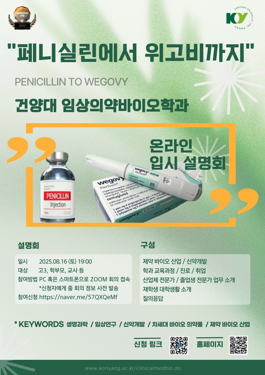 | 제목 | [건양대 임상의약바이오학과] "페니실린에서 위고비까지" 온라인 입시 설명회 안내 | ||||